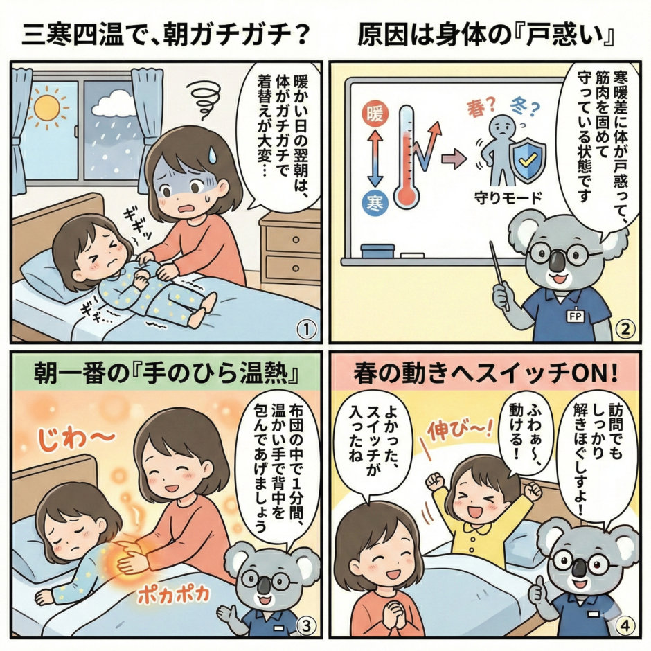 訪問にお伺いした際は、その「朝の強張り」が少しでも早く解けるよう